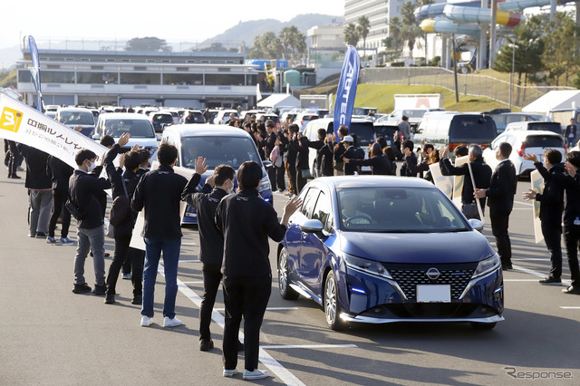恒例の表彰では北東/南西各方面から最も遠く来場した遠来賞に、北海道からのセレナと佐賀からのオーラが選ばれた。走行距離の長い過走行大賞は38万8000kmのプリメーラが受賞し、会場から大きな拍手が送られた。オーナーカーに負けじと会場を彩ったのがオーテック/NISMO仕様の現行車だ。リーフや『ルークス』などの最新モデルに加え、福祉車両、海外仕様ながら日本導入が期待される『パトロールNISMO』までずらりと並び、熱心に車両説明を受ける来場者の姿も目立った。さらに発表前のモデルも特別公開された。