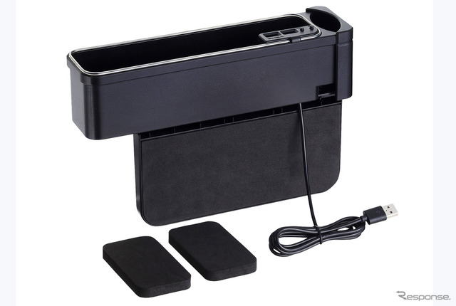 当品は、高機能であることが特長だ。LEDイルミを搭載しインテリアのドレスアップアイテムとしても機能する。またライトにより夜間のモノの出し入れがしやすい。さらには、リバーシブルタイプのUSB-Aポートも2口装備されている。加えて、トレイのみならずドリンクホルダーも増設可能だ。
