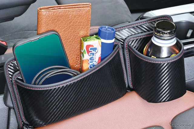 そして、ルックスにも工夫が凝らされている。カーボン調の素材が採用されているので、車内にスポーティな雰囲気を付与できる。なお、ポケットは小物用とドリンク用の2つを備える。そしてそれらは取り外して位置を入れ替えられる。運転席でも助手席でも、使いやすいように設置の仕方をアレンジできる。
