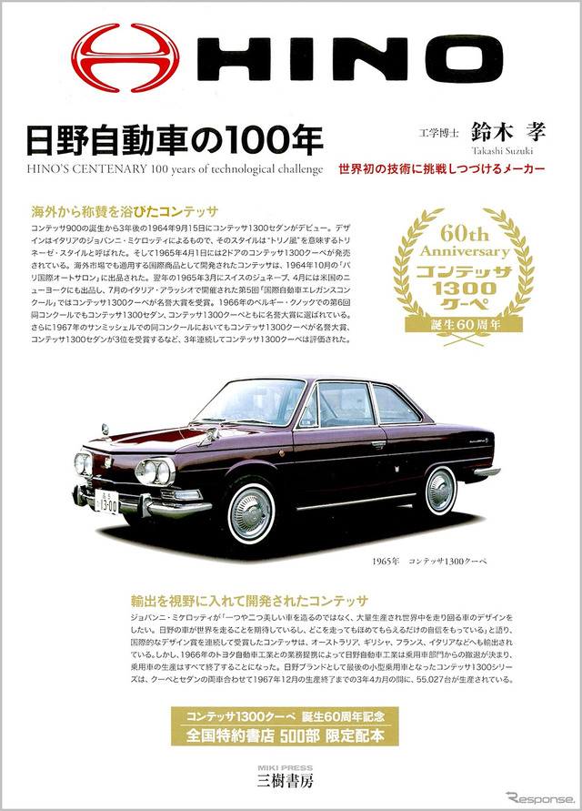 本書は、2019年11月にまとめられた増補二訂版を基に、『コンテッサ1300』クーペ誕生60周年を記念したカバーデザインにした新装版だ。イタリアのデザイナー、ミケロッティが手がけたコンテッサは1965年に発売された。国際的なデザイン賞を数多く受賞し、日野が乗用車分野でも高い評価を得た象徴的なモデルである。