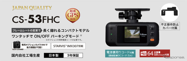 CS-53FHCは前方録画をメインとしたシンプルモデルで、本体に前方録画カメラを搭載し、必要に応じてオプションの別体リアカメラを追加することで後方録画にも対応できる。STARVIS IMX307を搭載した「ナイトクリアVer.2」により、夜間やトンネルなど少ない光量でも綺麗な映像を記録できる。