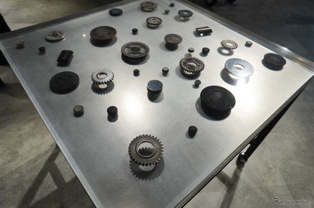スペースには、ヤマハが製造していたFRP製プールの廃材でできたテーブルやベンチのほか、ボート運搬用の台車やボートのハンドル、輸送時の梱包材などでできた什器や家具が並ぶ。これらを第一弾として、今回公開された第二弾では「バイク」をテーマに、実際の部品を使った家具を制作。ヤマハのバイクがもたらす“感動”や“遊び”、それを支えるモノづくり職人の技術を新たなカタチで蘇らせた。