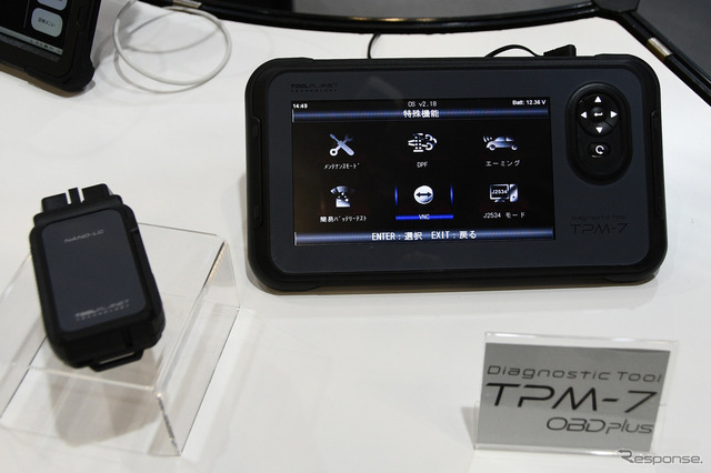 今回の展示で存在感を放っていたのがスキャンツールだ。なかでも最新モデルとなる「TPM-7 OBD plus」は注目の的となっていた。