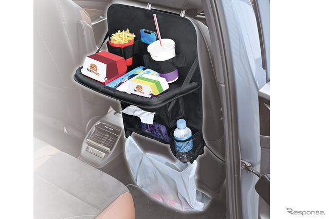 トレイ部は小物をさまざま置けるワイド仕様となっていて、マルチバンドを使うことで500mlペットボトル、500ml紙パック、スマホなどを収納できる。下部にはティッシュも入れられる(ティッシュカバー付き)。トレイを閉じたときにもドリンク等を収納できるメッシュポケットも装備する。ゴミ袋を吊り下げられるフックも備えられている。