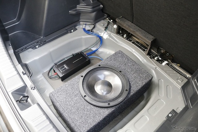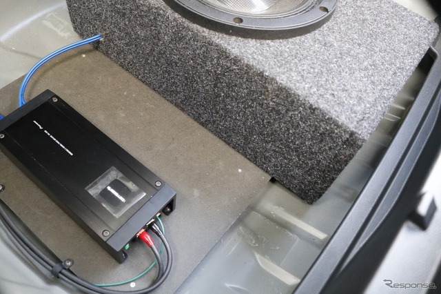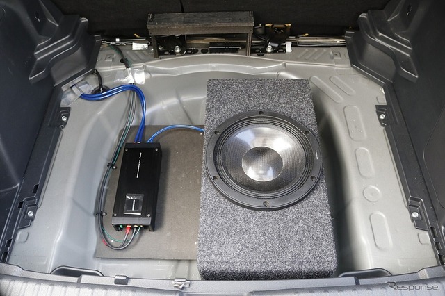 ラゲッジに収められたのはサブウーファーと、それをドライブするパワーアンプだ。フロントスピーカー関連の機器については、すべてコックピット側で完結させているのもこのクルマの注目点である。