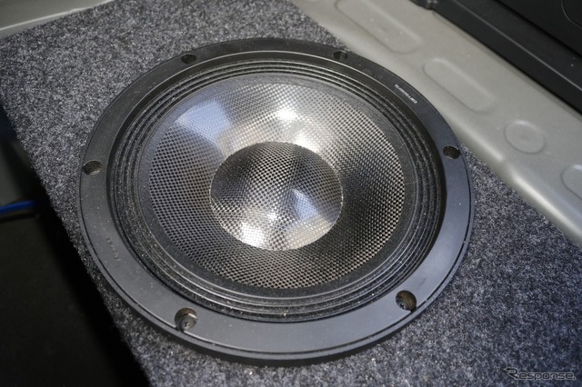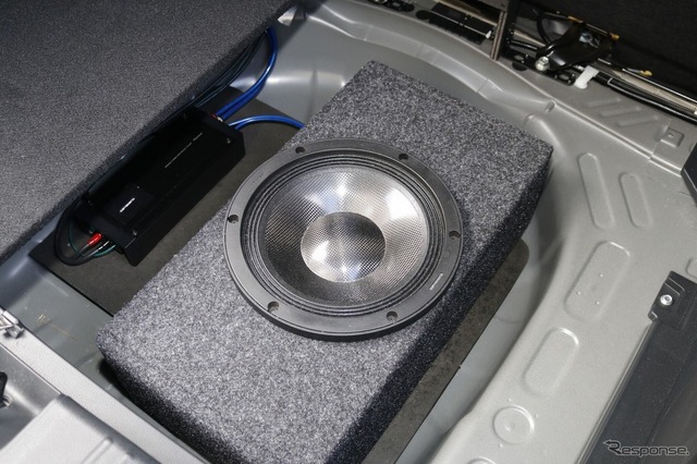 サブウーファーにはカロッツェリアのTS-W1000RSをチョイス。高品位な低音再生が可能な定番サブウーファーを使い、安定感ある低音を奏でるのが狙いだ。ラゲッジスペースの床下形状に合わせた縦長のエンクロージャーも印象的で、容量確保とスペース効率を計算した作り込みが見て取れる。