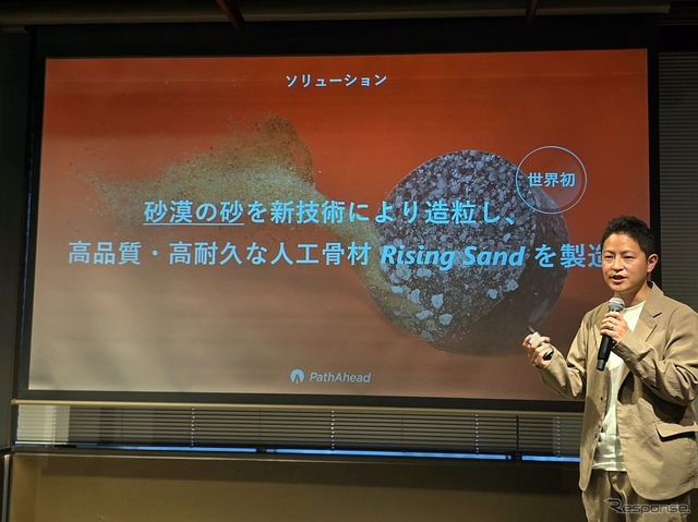 3月31日、ホンダ発のスタートアップ「PathAhead(パスアヘッド)」の設立発表会が開かれた。事業内容は、砂漠の砂から人工骨材を作り、アフリカの道路に供給すること。代表の伊賀将之さんは、2012年の入社以来、ホンダ(本田技術研究所)で四輪のボディに使われる金属材料を研究してきたエンジニアだ。