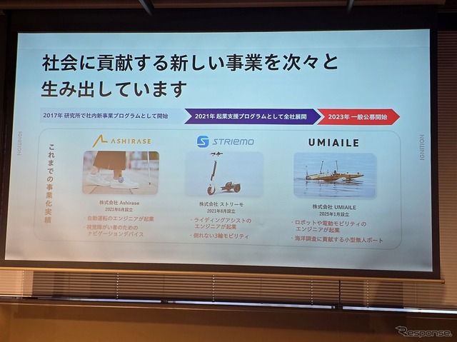 ホンダには、新事業創出プログラム「IGNITION(イグニッション)」がある。2017年に研究所内のプログラムとして始まり、2020年に起業・独立の選択肢が加わった。従業員の独創的なアイデアや技術を社会実装につなげる仕組みで、これまでに視覚障害者向け歩行支援デバイスの「ASHIRASE」や電動三輪モビリティの「Striemo」などが生まれている。