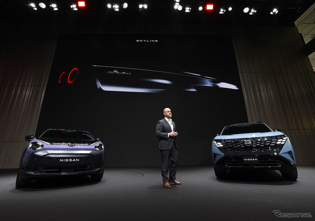 コアモデルの『エクストレイル/ローグ e-POWER』や、『ジュークEV』が世界初公開となったほか、日本市場向けに日産らしさを体現し、ブランドの情緒的価値と革新性を担う「ハートビートモデル」として新型『スカイライン』を投入することを発表。往年のスカイラインを思わせるテールランプと筆記体のロゴなど、デザインの一部が公開された。