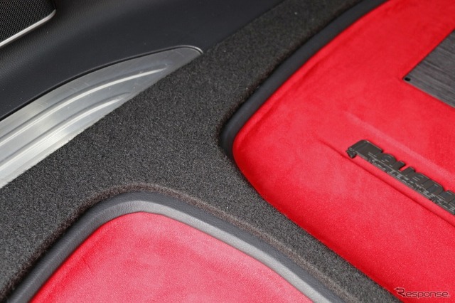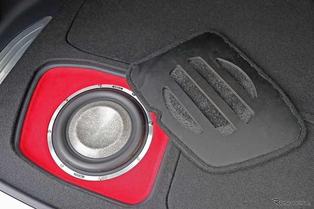ラゲッジフロアは、先にも紹介した通りレッドの人工スエードを使った鮮烈なフィニッシュを採用。ブラックレザーの縁取りはラゲッジのサイドウォールともぴたりと合い、完成度の高さを物語る。フラットに組まれたラゲッジは、ボードを被せれば実用性も兼ね備える。オーナーが思い描いた“魅せるオーディオ”が、理想的な形で完成した。