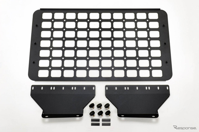 ストレージパネルシリーズ第3弾となる同製品は、ラゲッジルーム(荷室)の天井付近にある使われていないスペースを有効活用するためのアイテムだ。角穴と丸穴が開いたパネル構造により、モールシステムに対応した小物ケースやポーチを固定できるほか、M8アイナットやボルトを使って拡張することも可能だ。