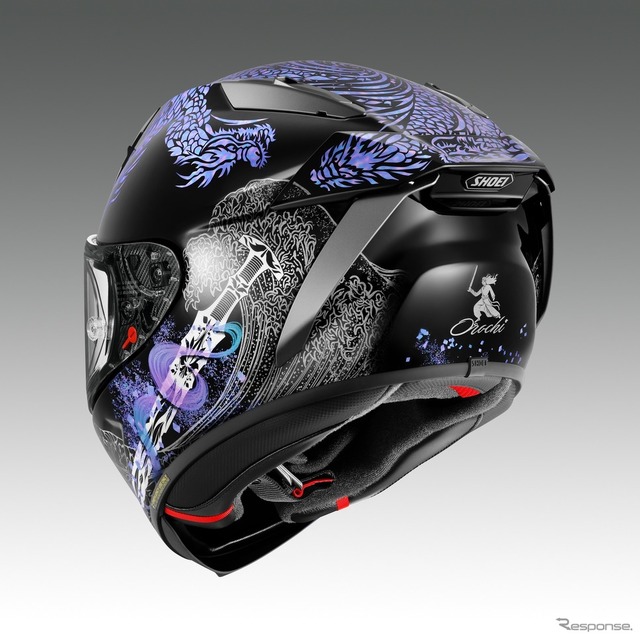 「オロチ」は螺鈿細工風の鮮やかな大蛇たちがヘルメット天面部に乱舞しているデザインだ。八岐大蛇をモチーフにしたものなのか、刀ではなく剣も描かれているほか、後部には剣を構える武者も描かれている。今回の新色追加で既存カラーのブラック/ブルー[TC-10](6月発売予定)と併せて2カラー展開となった。